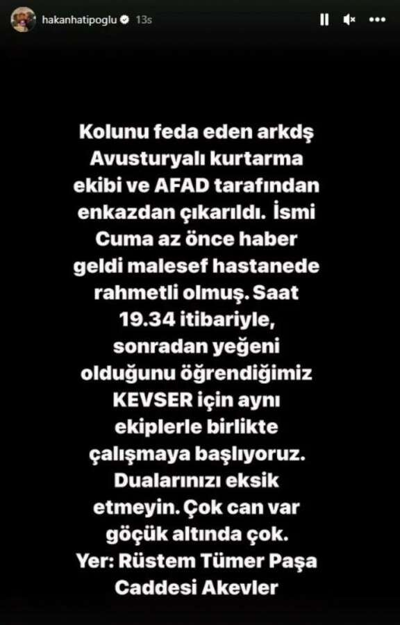 Kolunu feda eden arkadaş Avusturyalı kurtarma ekibi ve AFAD tarafından enkazdan çıkarıldı. İsmi Cuma, az önce haber geldi maalesef hastanede rahmetli olmuş. Saat 19.34 itibarıyla, sonradan yeğeni olduğunu öğrendiğimiz Kevser için aynı ekiplerle birlikte çalışmaya başlıyoruz. Dualarınızı eksik etmeyin. Çok can var göçük altında çok.