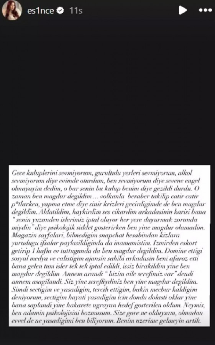 Hancı'nın ifadesi sonrası eski eşi Esin Çepni kendini tutamayıp evlilik süresince yaşadıklarını açık açık anlattı. Çepni; ''Gece kulüplerini sevmiyorum, gürültülü yerleri sevmiyorum, alkol sevmiyorum diye evimde oturdum. Ben sevmiyorum diye sevene engel olmayayım dedim; o bar senin, bu kulüp benim diye gezildi durdu. O zaman ben mağdur değildim... Volkan'la beraber takılıp çatır çatır p*tlarken, "yapma etme" diye sinir krizleri geçirdiğimde de ben mağdur değildim.