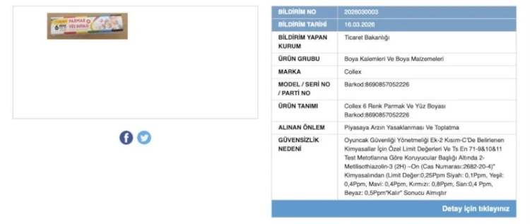 “Boya Kalemleri ve Boya Malzemeleri” kategorisinde yapılan incelemelerde, bir markaya ait parmak ve yüz boyalarında yasal sınırların oldukça üzerinde zararlı kimyasal maddelere rastlandı.