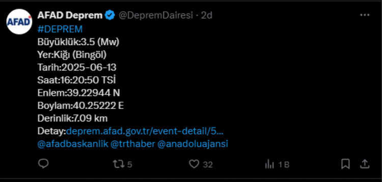 AFAD Bingöl'ün Kiğı ilçesinde 3.5 büyüklüğünde deprem olduğunu bildirdi. Depremin büyüklüğünün 7.09 kilometre olduğu öğrenildi.