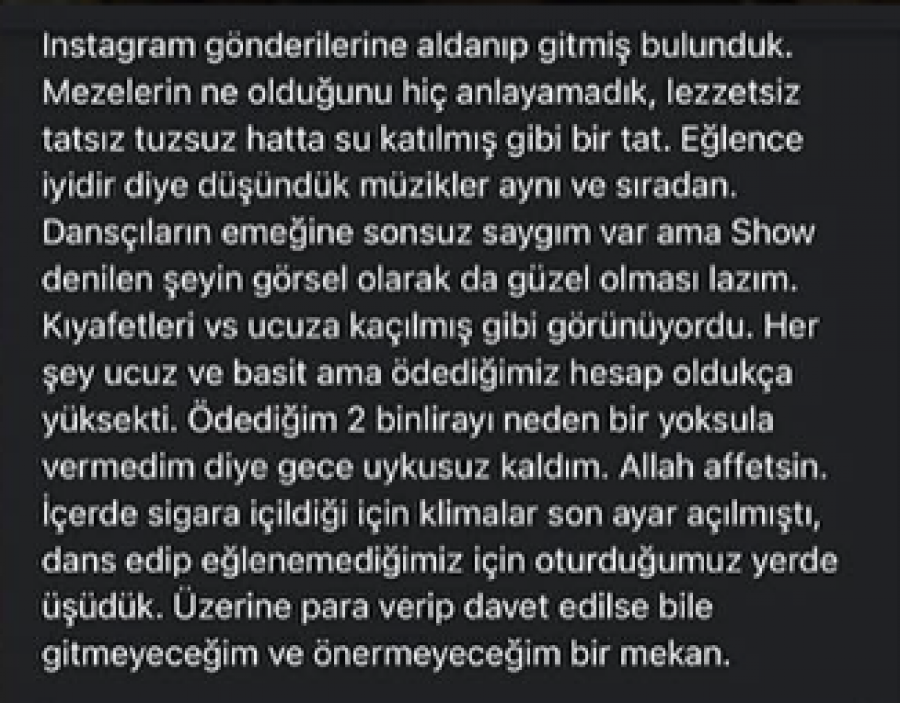 "Instagram gönderilerine aldanıp gitmiş bulunduk. Mezelerin ne olduğunu hiç anlayamadık, lezzetsiz tatsız tuzsuz hatta su katılmış gibi bir tat. Eğlence iyidir diye düşündük müzikler aynı ve saradan Danspann emeğine sonsuz saygım var ama show denilen şeyin görsel olarak da güzel olması lazım. Kıyafetleri ucuza kaçılmış gibi görünüyordu. Her şey ucuz ve basit ama ödediğimiz hesap oldukça yüksekti. Ödediğim 2 bin lirayı neden bir yoksula vermedim diye gece uykusuz kaldım. Allah affetsin içerde sigara içildiği için kılimalar son ayar açılmıştı, dans edip eğlenemediğimiz için oturduğumuz yerde üşüdük. Üzerine para verip gitmeyeceğim ve önermeyeceğim bir mekan."