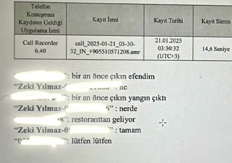 Zeki Yılmaz’ın telefon dökümünde 21 Ocak gecesi saat 03.30’da otel yetkilileri ile 14.6 saniyelik görüşme yaptığı ve otel yetkililerine ‘Bir an önce çıkın efendim. Bir an önce çıkın yangın çıktı. Restorandan geliyor. Lütfen lütfen” şeklindeki konuşması da dava dosyasında yer aldı.