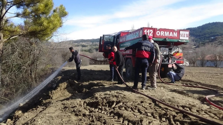 Bolu’nun Mudurnu ilçesine bağlı Uzunçam köyünde, kuru otların bulunduğu arazide henüz bilinmeyen bir nedenle yangın çıktı.