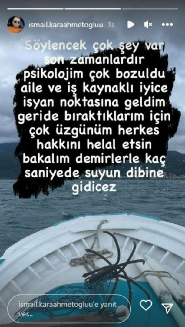 Olay, Sürmene ilçesi Soğuksu mevkii açıklarında 28 Temmuz günü meydana geldi. Sabah saatlerinde limandan babasına ait tekne ile açılan İsmail Karaahmetoğlu, ayağına bağladığı çapa ile denize atladı. Sosyal medya hesabında denizde çektiği bir görüntüye "Buraya kadarmış” yazarak paylaşımda bulunan Karaahmetoğlu, daha sonraki paylaşımda ise "Söylenecek çok şey var, son zamanlarda psikolojim çok bozuldu. Aile ve iş kaynaklı iyice isyan noktasına geldim. Geride bıraktıklarım için çok üzgünüm. Herkes hakkını helal etsin. Bakalım demirlerle kaç saniyede suyun dibine gideceğiz" ifadelerini kullanmıştı.