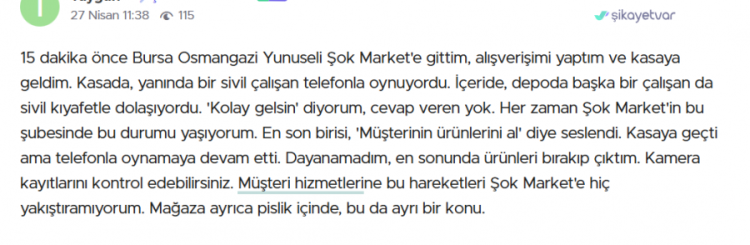 "15 dakika önce Bursa Osmangazi Yunuseli Şok Market'e gittim, alışverişimi yaptım ve kasaya geldim. Kasada, yanında bir sivil çalışan telefonla oynuyordu. İçeride, depoda başka bir çalışan da sivil kıyafetle dolaşıyordu. 'Kolay gelsin' diyorum, cevap veren yok. Her zaman Şok Market'in bu şubesinde bu durumu yaşıyorum. En son birisi, 'Müşterinin ürünlerini al' diye seslendi. Kasaya geçti ama telefonla oynamaya devam etti. Dayanamadım, en sonunda ürünleri bırakıp çıktım. Kamera kayıtlarını kontrol edebilirsiniz. Müşteri hizmetlerine bu hareketleri Şok Market'e hiç yakıştıramıyorum. Mağaza ayrıca pislik içinde, bu da ayrı bir konu."