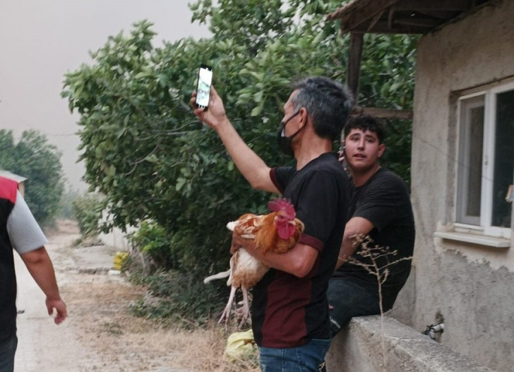 Alevlerin yaklaştığı köyde bir vatandaş horozunu kucağına alarak köyü terletti