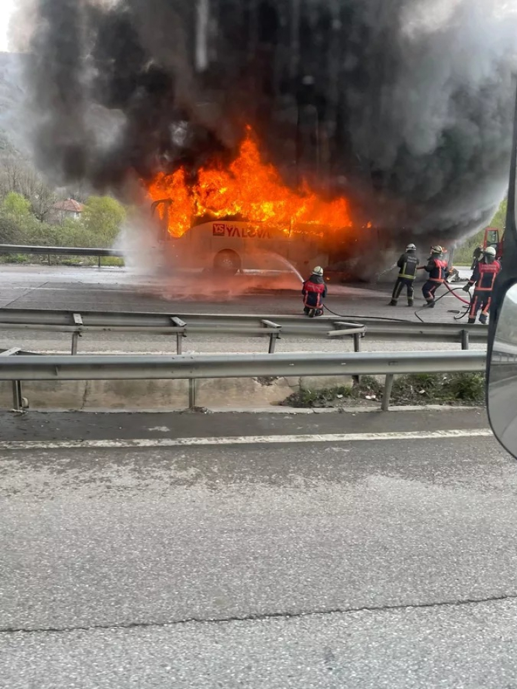 Olay bugün saat 13.20 sıralarında Orhangazi - Yalova yolu üzeri Süpürgelik mevkiinde meydana geldi. Alınan bilgilere göre Yalova yönüne gitmekte olan için yolcu dolu otobüsün motor bölümünden yükselen alevleri fark eden sürücü aracı emniyet şeridine çekti.