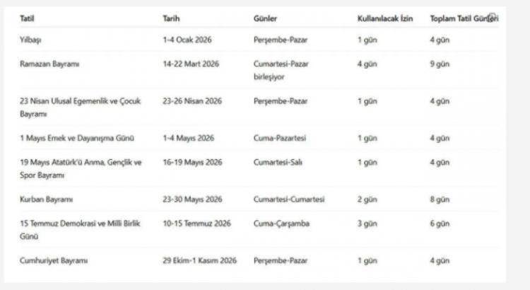 Yılbaşı (1-4 Ocak 2026): Perşembe gününe denk gelen yılbaşında sadece 1 gün izin alarak 4 günlük tatil yapmak mümkün.