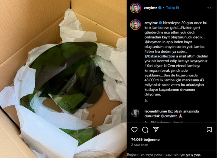 "Neredeyse 20 gün önce bu kırık lamba eve geldi...Fiziken geri gönderdim rica ettim yok dedi onlinedan kayıt oluşturun..ok dedik...@beymen in app inden kayıt oluşturdum arayan soran yok Lamba 43bin lira dedim ya sabır...@Bakaracollection a mail attım dediler yok biz kontrol edip kutuya koyuyoruz ! Yani diyor ki Cem efendi lambayı kırmışssın bırak şimdi iade ayaklarını....Ben de huzurunuzda 43.000 tl lik lamba için markasına 43 milyonluk zarar veren bu arkadaşları kutluyor başarılarının devamını diliyorum." dedi.