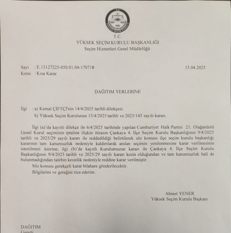 Yüksek Seçim Kurulu (YSK), CHP'nin 6 Nisan 2025 tarihinde yapılan 21. Olağanüstü Kurultayı'nın iptali istemli başvuruyu reddetti.