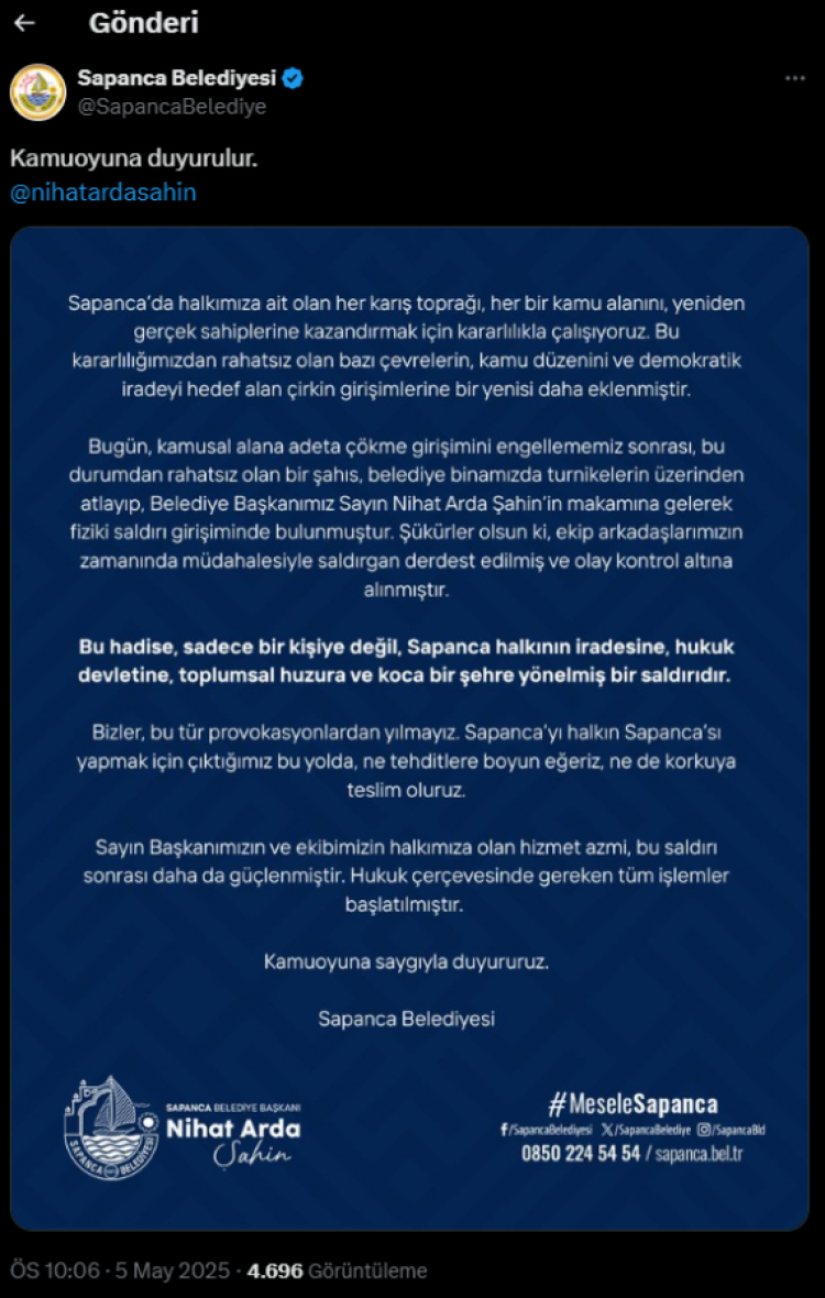 Sapanca Belediyesi'nin X (Twitter) platformundaki sosyal medya hesabından paylaşılan yazılı açıklamada: