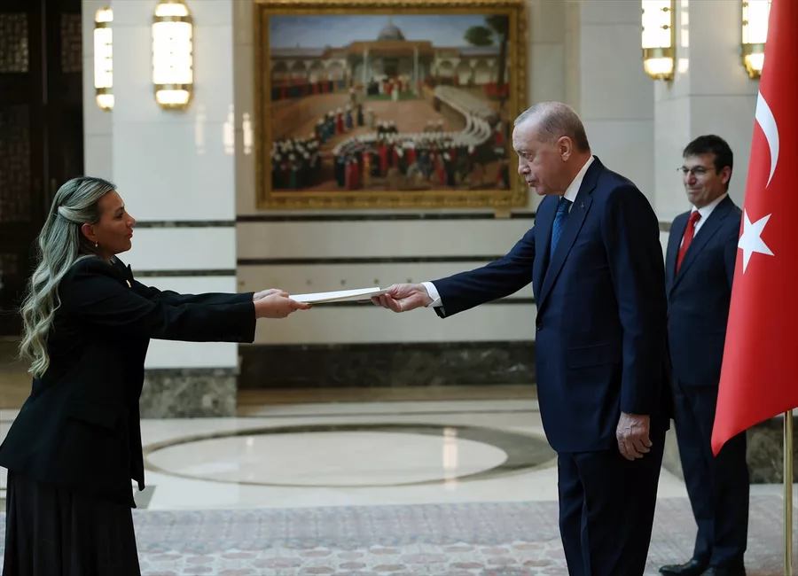 Cumhurbaşkanlığı Külliyesi'ndeki kabulde, Filipinler Büyükelçisi Jamie Ramon Torre Ascalon JR, Kenya Büyükelçisi Anthony Mwaniki Muchiri, Kolombiya Büyükelçisi Yenniffer Edilma Parra Moscoso, Peru Büyükelçisi Luz Betty Caballero Morales ve Rusya Büyükelçisi Sergey Vasilievich Vershinin, Cumhurbaşkanı Erdoğan'a güven mektuplarını sundu.