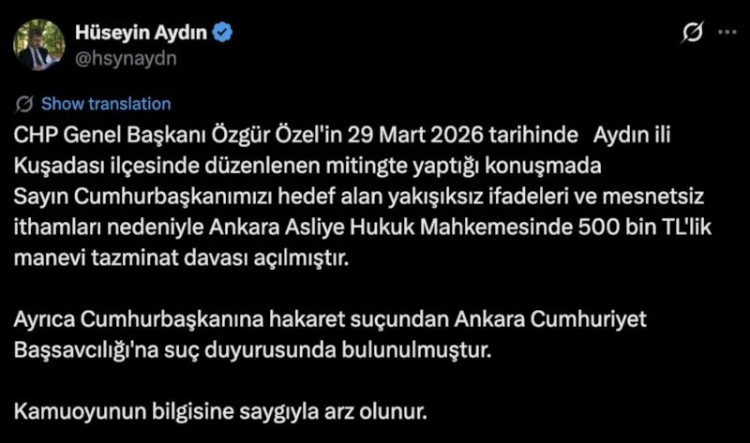 "CHP Genel Başkanı Özgür Özel'in 29 Mart 2026 tarihinde Aydın ili Kuşadası ilçesinde düzenlenen mitingde yaptığı konuşmada Sayın Cumhurbaşkanımızı hedef alan yakışıksız ifadeleri ve mesnetsiz ithamları nedeniyle Ankara Asliye Hukuk Mahkemesi'nde 500 bin TL'lik manevi tazminat davası açılmıştır.