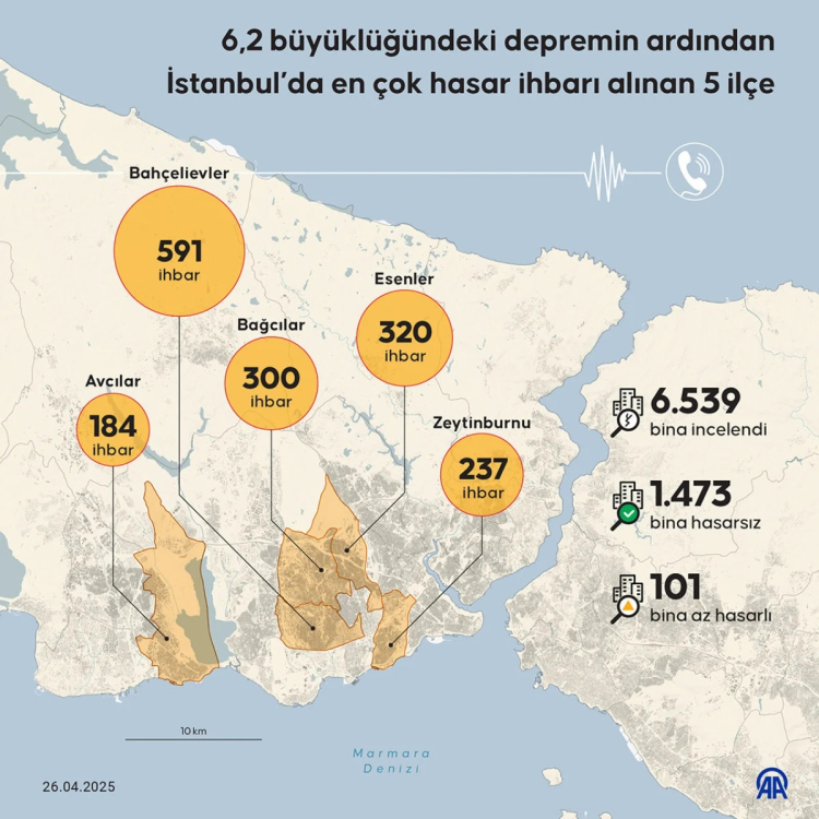 6,2 büyüklüğündeki depremin ardından İstanbul’da en çok hasar ihbarı alınan 5 ilçe Bahçelievler, Esenler, Bağcılar, Zeytinburnu ve Avcılar olarak sıralandı.