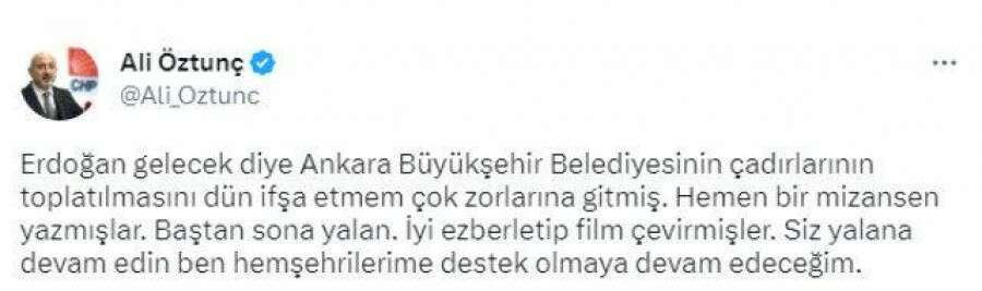 Söz konusu olayla ilgili açıklama yapan Öztunç ise, "Erdoğan gelecek diye Ankara Büyükşehir Belediyesinin çadırlarının toplatılmasını dün ifşa etmem çok zorlarına gitmiş. Hemen bir mizansen yazmışlar. Baştan sona yalan. İyi ezberletip film çevirmişler. Siz yalana devam edin ben hemşehrilerime destek olmaya devam edeceğim" dedi.