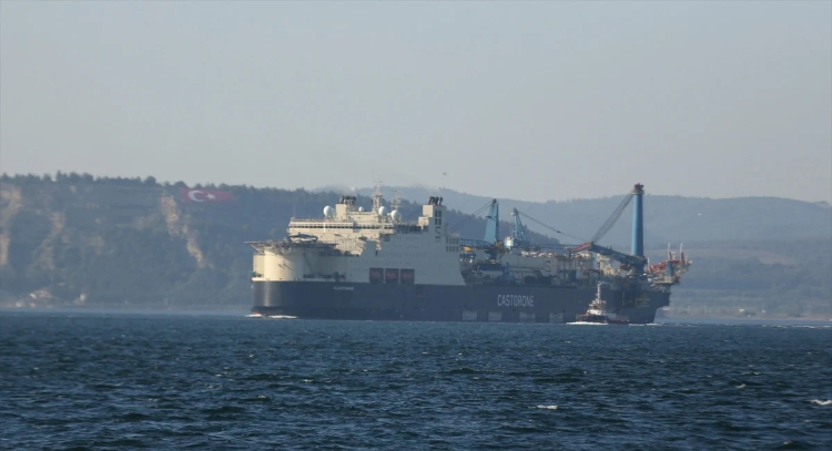 Türkiye'nin Karadeniz'de keşfettiği doğalgaz için boru döşeyen "Castorone" gemisi, Çanakkale Boğazı'ndan geçti.