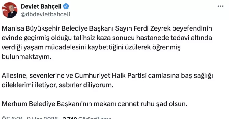 Ferdi Zeyrek'in kaybı sonrası Ömer Çelik'in ardından MHP Genel Başkanı Devlet Bahçeli'den de bir mesaj geldi.