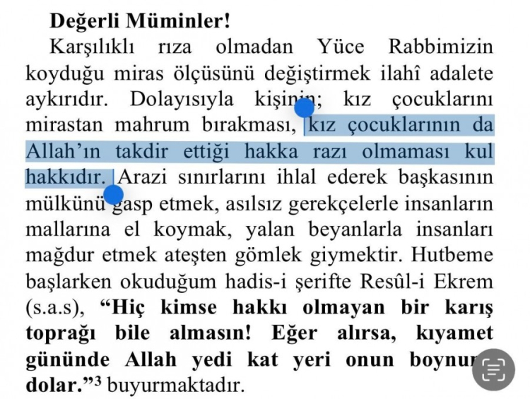 Hutbede, "Karşılıklı rıza olmadan Yüce Rabbimizin koyduğu miras ölçüsünü değiştirmek ilahî adalete aykırıdır. Dolayısıyla kişinin; kız çocuklarını mirastan mahrum bırakması, kız çocuklarının da Allah'ın takdir ettiği hakka razı olmaması kul hakkıdır" ifadelerine yer verildi.