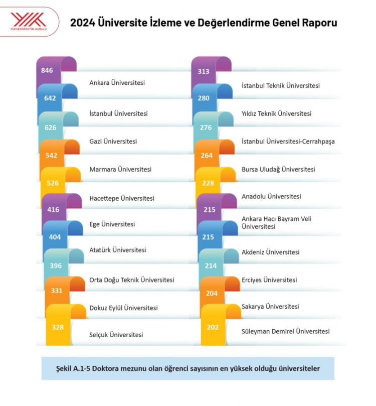 En fazla doktora mezunu veren üniversite 846 mezunla Ankara Üniversitesi oldu. Ankara Üniversitesini 642 mezunla İstanbul Üniversitesi, 626 mezunla Gazi Üniversitesi, 542 mezunla Marmara Üniversitesi ve 526 mezunla Hacettepe Üniversitesi takip etti.