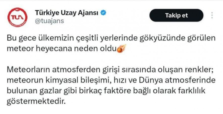 Öte yandan Türkiye Uzay Ajansı sosyal medya hesabından yapılan açıklamada, gökyüzünde görülen ışık süzmesinin meteor olduğu bildirildi.