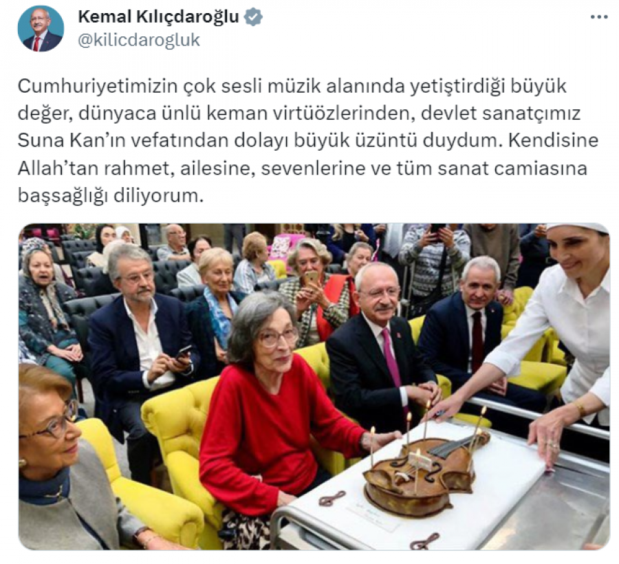 Kılıçdaroğlu, "Cumhuriyetimizin çok sesli müzik alanında yetiştirdiği büyük değer, dünyaca ünlü keman virtüözlerinden, devlet sanatçımız Suna Kan'ın vefatından dolayı büyük üzüntü duydum. Kendisine Allah'tan rahmet, ailesine, sevenlerine ve tüm sanat camiasına başsağlığı diliyorum" ifadesinde bulundu.