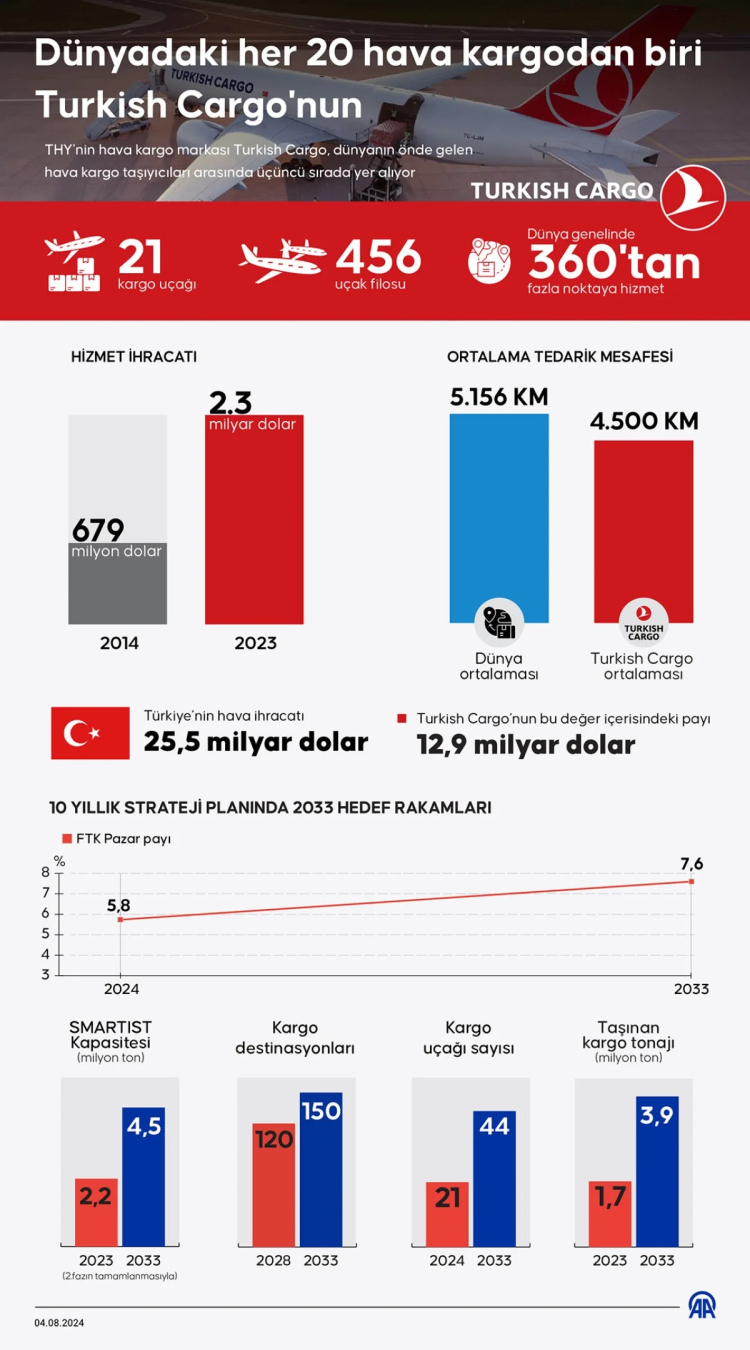 Türk, "Yıllık büyüme oranlarında ise (IATA FTK verilerine göre) ilk 10'daki majör rakiplerimizin hepsinden daha fazla büyüme sağladık. Bu başarılı performans, Turkish Cargo'nun uluslararası hava kargo sektöründeki konumunu güçlendirdi ve IATA FTK sıralamasında yüzde 5,8 pazar payı elde etmesini sağladı. Bu dönemdeki başarılarımız, pazar dinamiklerine hızlı adaptasyon yeteneğimiz ve operasyonel mükemmeliyet ilkemiz ile mümkün oldu. Bu durum hava kargo sektöründe güven inşa ederek sürdürülebilir bir büyüme içerisinde olduğumuzun da bir göstergesi." dedi.