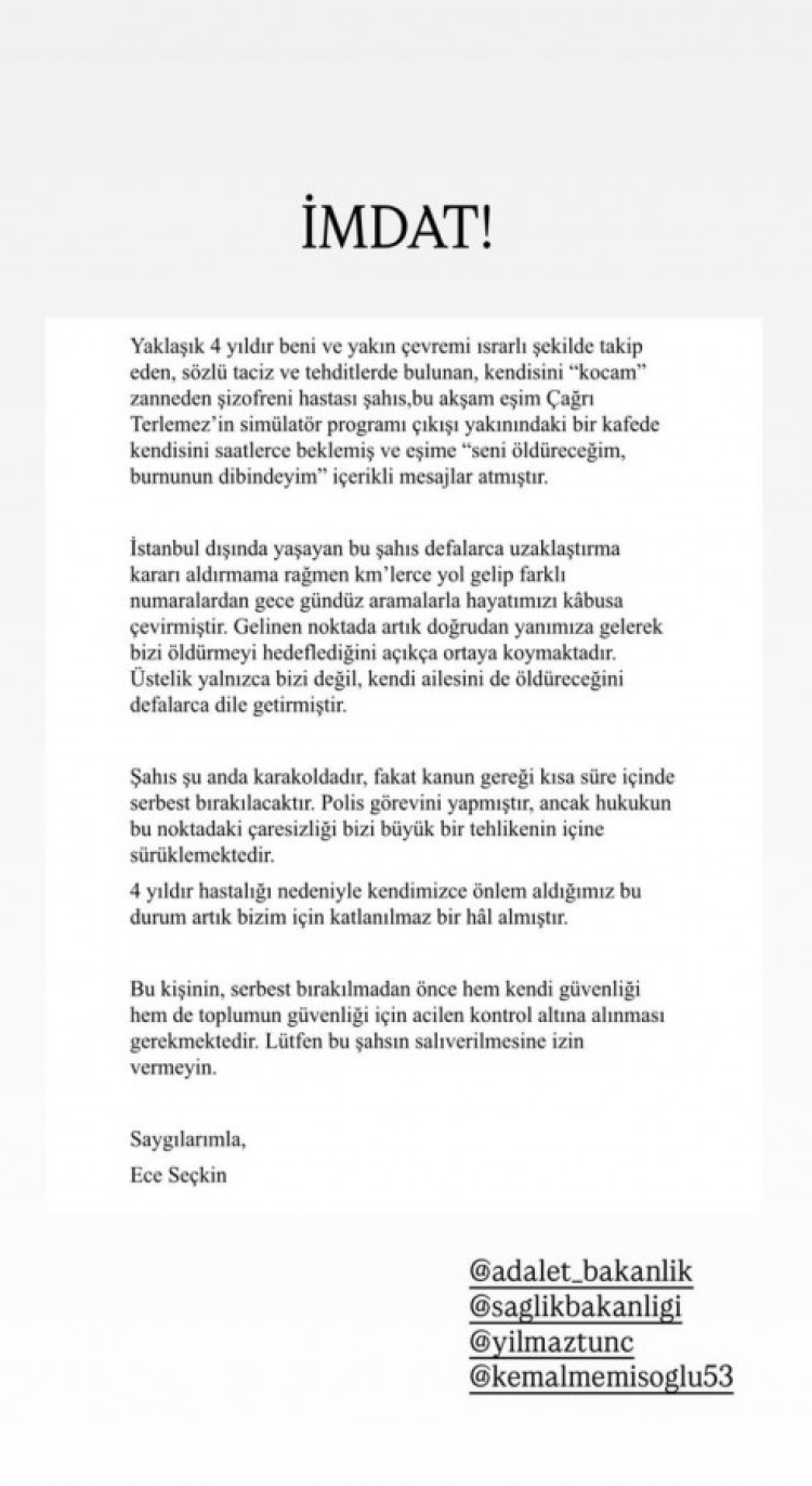 "Yaklaşık 4 yıldır beni ve yakın çevremi ısrarlı şekilde takip eden, sözlü taciz ve tehditlerde bulunan, kendisini "kocam" zanneden şizofreni hastası şahıs, bu akşam eşim Çağrı Terlemez'in simülatör programı çıkışı yakınındaki bir kafede kendisini saatlerce beklemiş ve eşime "Seni öldüreceğim, burnunun dibindeyim." içerikli mesajlar atmıştır.
