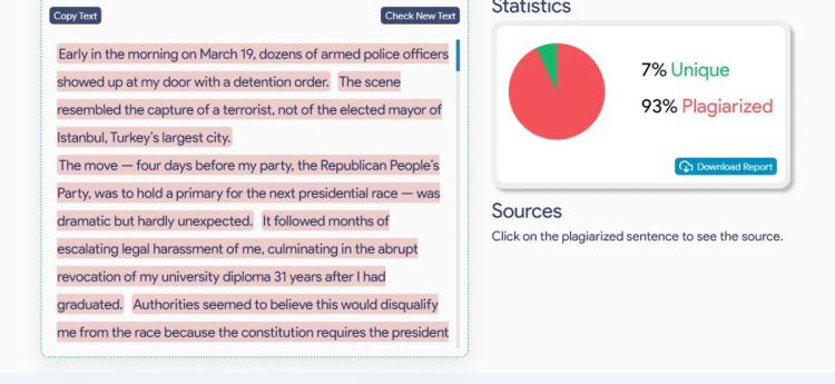 Yolsuzluk ve rüşvet soruşturması kapsamında tutuklanan Ekrem İmamoğlu, cezaevinde kaleme aldığı ilk yazıyı ABD merkezli New York Times gazetesi için yazdı. Ancak yapılan incelemelerde, yazının yüzde 93’ünün intihal içerdiği belirlendi.
