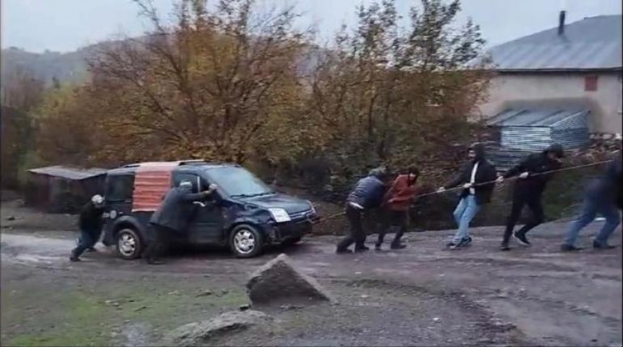 Köy sakinleri, halat bağladıkları ve yaklaşık 30 metre yokuş yukarı çektikleri aracı, düzlüğe çıkardı. Dayanışma örneği gösteren yaklaşık 15 kişi, daha sonra aracı pikaba yükledi.