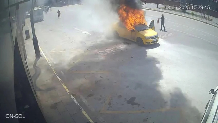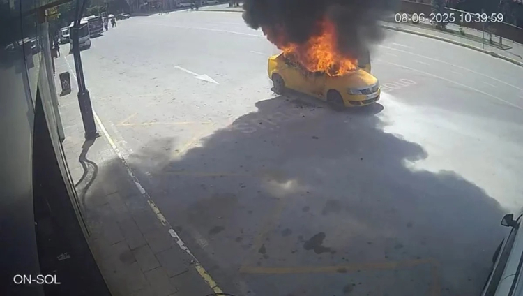 Aracın bir anda alev alması ve sürücünün son anda kurtulması güvenlik kameralarına saniye saniye yansıdı.