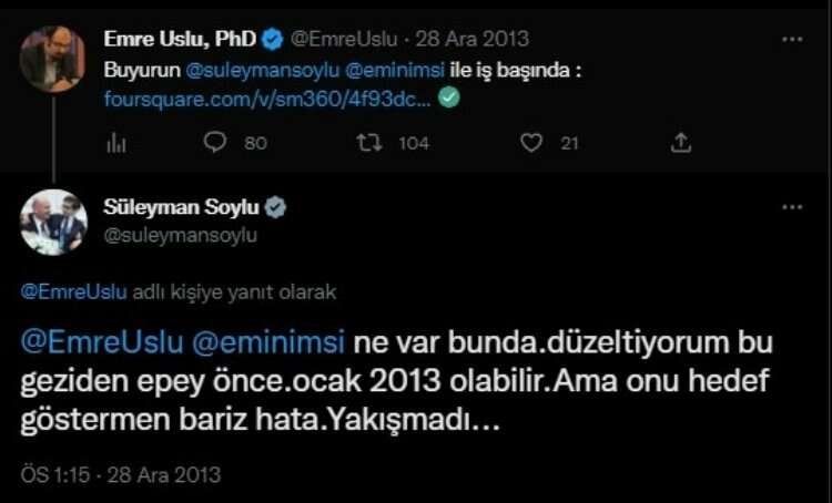 İçişleri Bakanı Soylu'nun 28 Aralık 2013 tarihinde şu an firari olarak aranan Emre Uslu ve "eminimsi" kullanıcılarıyla sosyal medya hesabından etkileşimi olduğu görüldü.