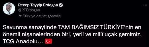 Sosyal medya hesabından da paylaşım yapan Cumhurbaşkanı Erdoğan, "Savunma sanayiinde TAM BAĞIMSIZ TÜRKİYE'nin en önemli nişanelerinden biri, yerli ve millî uçak gemimiz, TCG Anadolu..." ifadelerine yer verdi.