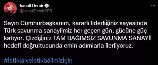 Savunma Sanayii Başkanı İsmail Demir de Erdoğan'ın paylaşımına yanıt vererek, "Sayın Cumhurbaşkanım, kararlı liderliğiniz sayesinde Türk savunma sanayiimiz her geçen gün, gücüne güç katıyor. Çizdiğiniz TAM BAĞIMSIZ SAVUNMA SANAYİİ hedefi doğrultusunda emin adımlarla ilerliyoruz." açıklamasını yaptı.