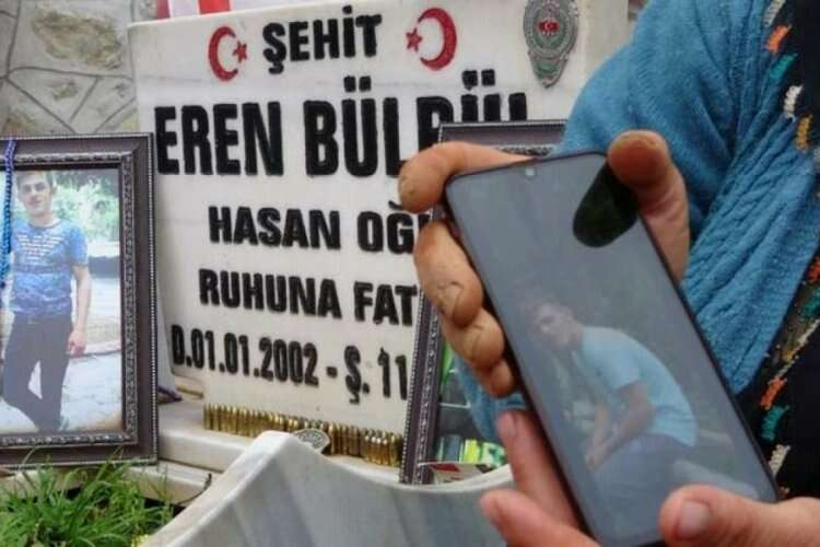 Şehit oğlunun kabri başından ayrılmayan ve oğlunun son fotoğrafını öpen Ayşe Bülbül, "Annen kurban olsun sana. Yayladaki okul çantanda kıyafetini buldum. Okul çantanın dibi yırtık, sürgüleri kopmuş oğlum. Güzel evladımı böyle toprağa verdim. Annen, gülen yüzüne kurban olsun. Eren, 'Anne beni bırakma' diyordun. Hakkını helal et oğlum. Kokun gelecek mi bana? Eren'im ne zaman kavuşacağız?" diyerek gözyaşı döktü.