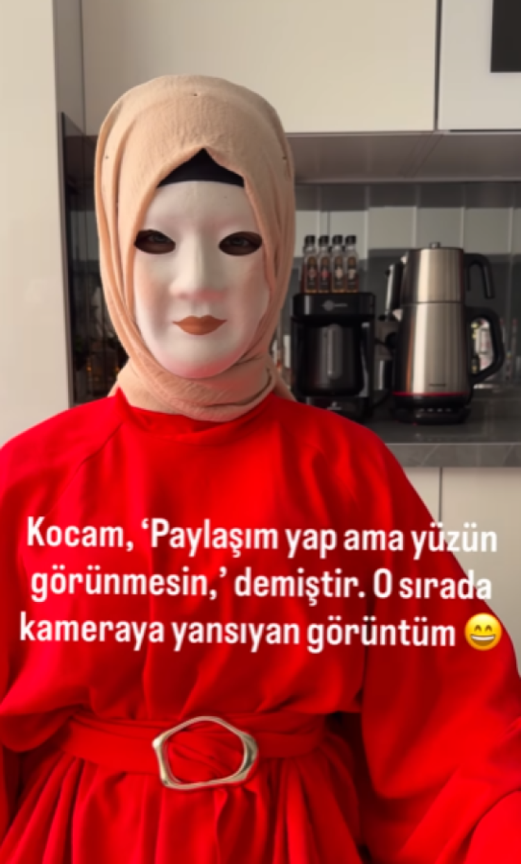 İçerik üreticisinin söylemlerine göre, eşinin "yüzünü gösterme" şartını kabul eden kadın, videolarında beyaz bir maske takarak içerik üretmeye başladı.