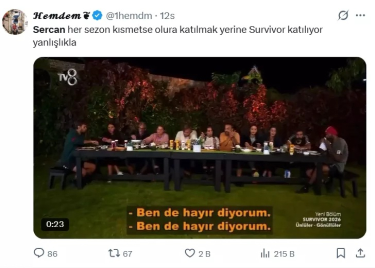 Survivor 2026'da bu hafta Eren elendi. Düello'ya kaybettikten sonra konseye geen Eren'i kırmızı takım istemedi. Eren'i Kırmızı takımda istemeyen Sercan'ın, Deniz'e aşık olduğu iddiaları ortaya atıldı.