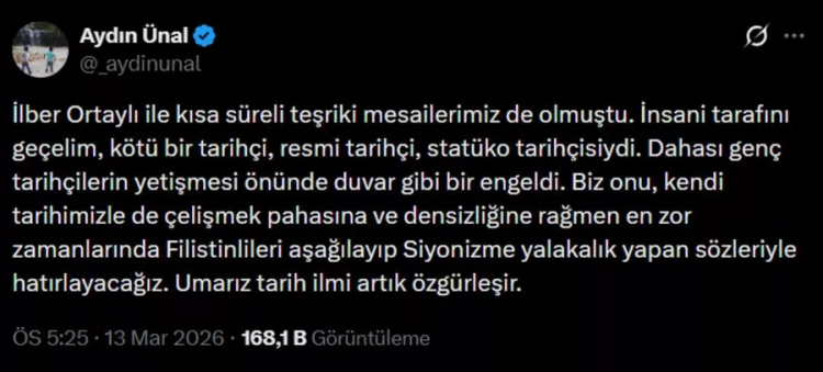 "İlber Ortaylı ile kısa süreli teşriki mesailerimiz de olmuştu. İnsani tarafını geçelim, kötü bir tarihçi, resmi tarihçi, statüko tarihçisiydi. Dahası genç tarihçilerin yetişmesi önünde duvar gibi bir engeldi. Biz onu, kendi tarihimizle de çelişmek pahasına ve densizliğine rağmen en zor zamanlarında Filistinlileri aşağılayıp Siyonizme yalakalık yapan sözleriyle hatırlayacağız. Umarız tarih ilmi artık özgürleşir."