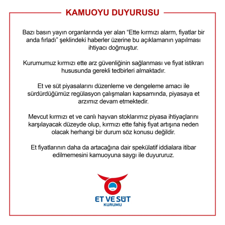 Bazı basın yayın organlarında yer alan "Ette kırmızı alarm, fiyatlar bir anda fırladı" şeklindeki haberler üzerine bu açıklamanın yapılmasına ihtiyaç doğmuştur. Kurumumuz kırmızı ette arz güvenliğinin sağlanması ve fiyat istikrarı hususunda gerekli tedbirleri almaktadır. Et ve süt piyasalarını düzenleme ve dengeleme amacı ile sürdürdüğümüz regülasyon çalışmaları kapsamında, piyasaya et arzımız devam etmektedir.