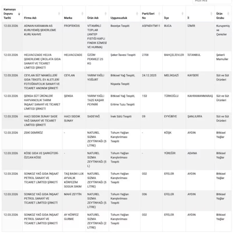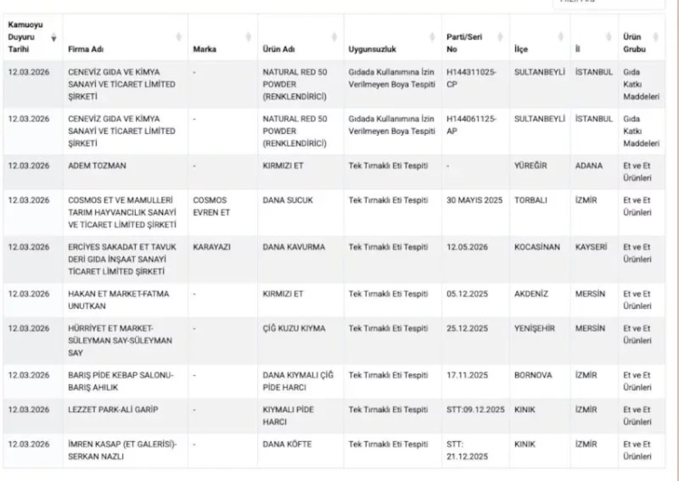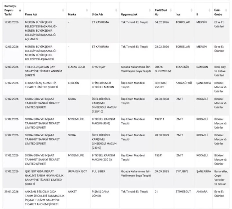 Tarım ve Orman Bakanlığı, "Sağlığı Tehlikeye Düşürecek Gıdalar" listesine 19 yeni ürün daha ekledi. Yapılan denetimlerde et ürünlerinden bal ve zeytinyağına, süt ürünlerinden çay ve baharatlara kadar birçok gıdada taklit ve tağşiş tespit edildi.