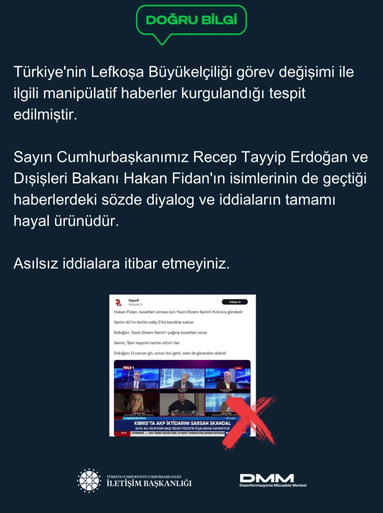 Türkiye'nin Lefkoşa Büyükelçiliği görev değişimi ile ilgili manipülatif haberlerin gündem olması üzerine Dezenformasyonla Mücadele Merkezi (DMM), açıklamada bulunmuştu.