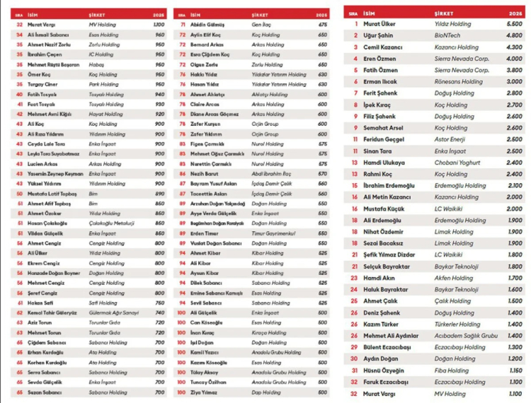 Onu, 4,8 milyar dolarla BioNTech'in kurucu ortağı Uğur Şahin ve 4,3 milyar dolarla Kazancı Holding'in sahibi Cemil Kazancı takip etti.