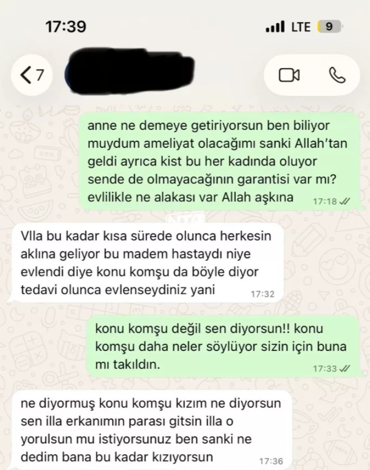 Paylaşılan mesajlarda genç kadının, yaşadığı sağlık sorununa rağmen evliliğiyle ilgili eleştirilmesine tepki gösterdiği görüldü. Kadın mesajında, "Kist bu, her kadında olabiliyor. Evlilikle ne alakası var?" diyerek kendini savundu.