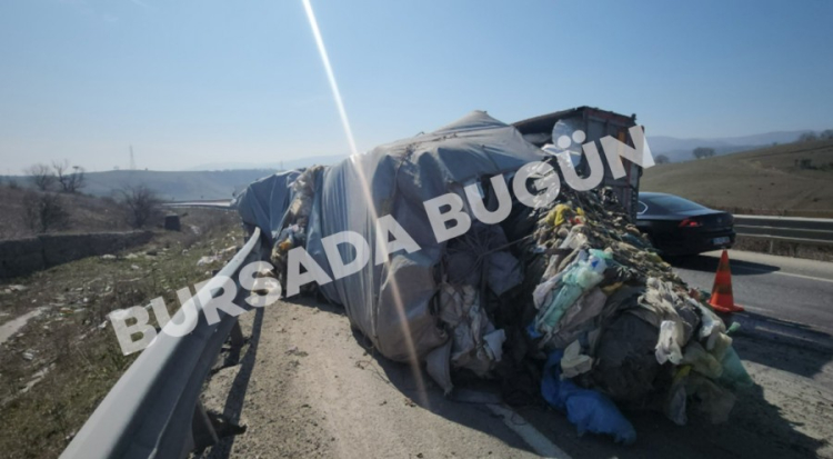 Alınan bilgilere göre Yalova'dan Bursa yönüne doğru gitmekte olan geri dönüşüm malzemesi yüklü tır, viraja geldiği esnada kontrolden çıkarak yol ortasına devrildi.