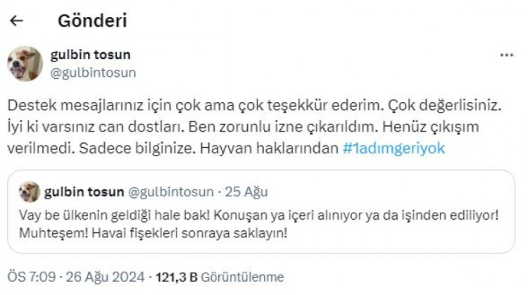 Gülbin Tosun'un, ABB Başkanı Mansur Yavaş'a yönelik tweet'i nedeniyle işine son verildiği iddia edilmişti. Tosun, sokak köpekleri konusunda Mansur Yavaş'ı etiketleyerek "Başkan siz 'Sokakta köpek olmaz, biz bakarız' derken hapsettiğiniz ve önlerinde suyu bile olmayan canlıları mı kastetmiştiniz! Ne diyeyim bir bardak suya muhtaç olun o zaman!" ifadelerini paylaşmıştı.