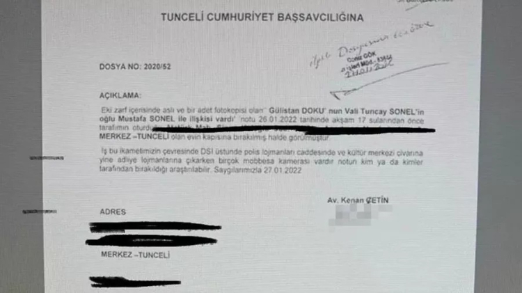 Sabah'tan Ercan Topaç'ın haberine göre kapıya bırakılan notta "Gülistan Doku'nun Vali Tuncay Sonel'in oğlu Mustafa Sonel ile ilişkisi vardı" ifadelerinin yer aldığı görüldü.