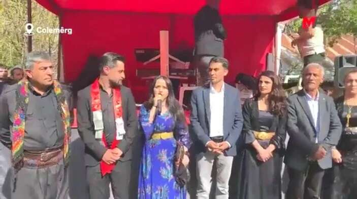 Tek sıra haline girerek parti bayraklarıyla karşılanan HDP'liler, düğünde bir de konuşma yaptı.