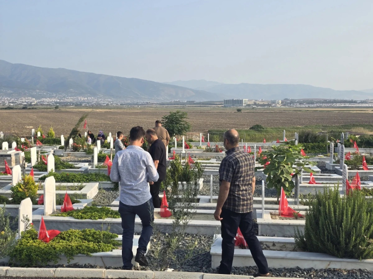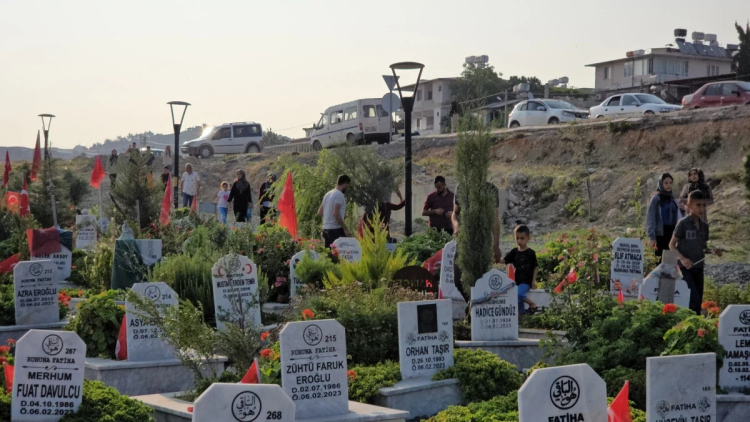 Kurban Bayramı'nın ilk gününde, Antakya ilçesi Narlıca Mahallesi'ndeki deprem şehitliği yakınlarını kaybedenlerle dolup, taştı.
