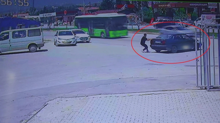 Antakya ilçesisinde, sürücüsünün el frenini çekmeyi unuttuğu otomobil, ana yola çıkarak halk otobüsüyle çarpıştı. El frenini çekmeyi unutan sürücünün otomobilin arkasında koştuğu anlar kameraya yansıdı.