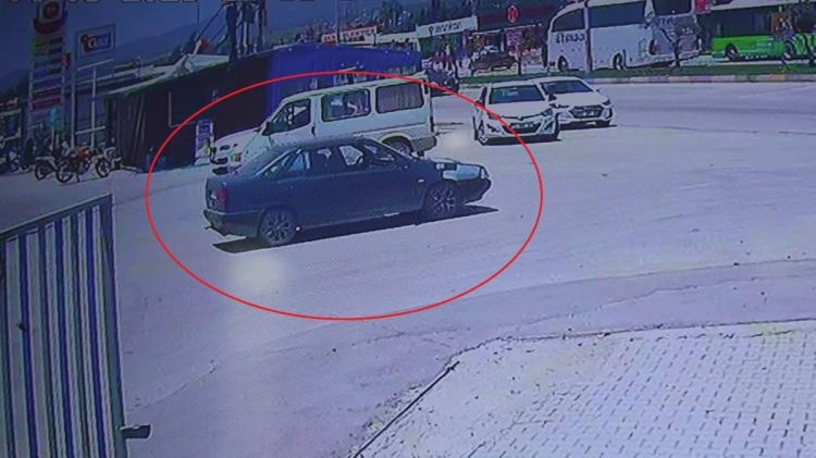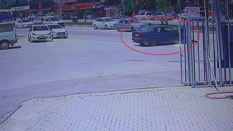 Sürücünün markette olduğu esnada hareket etmeye başlayan otomobil, hızla yola doğru çıktı.Anbean kameraya yansıyan olayda otomobil, seyir halindeki halk otobüsüyle çarpıştı.