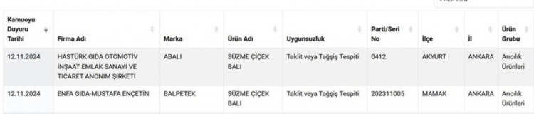 Söz konusu listede Ankara merkezli iki ünlü bal firması yer aldı. Zincir marketler ve e-ticaret sitelerinde satılan "Abalı" ve "Balpetek" markalı ballarda taklit ve tağşiş yapıldığı belirlendi.